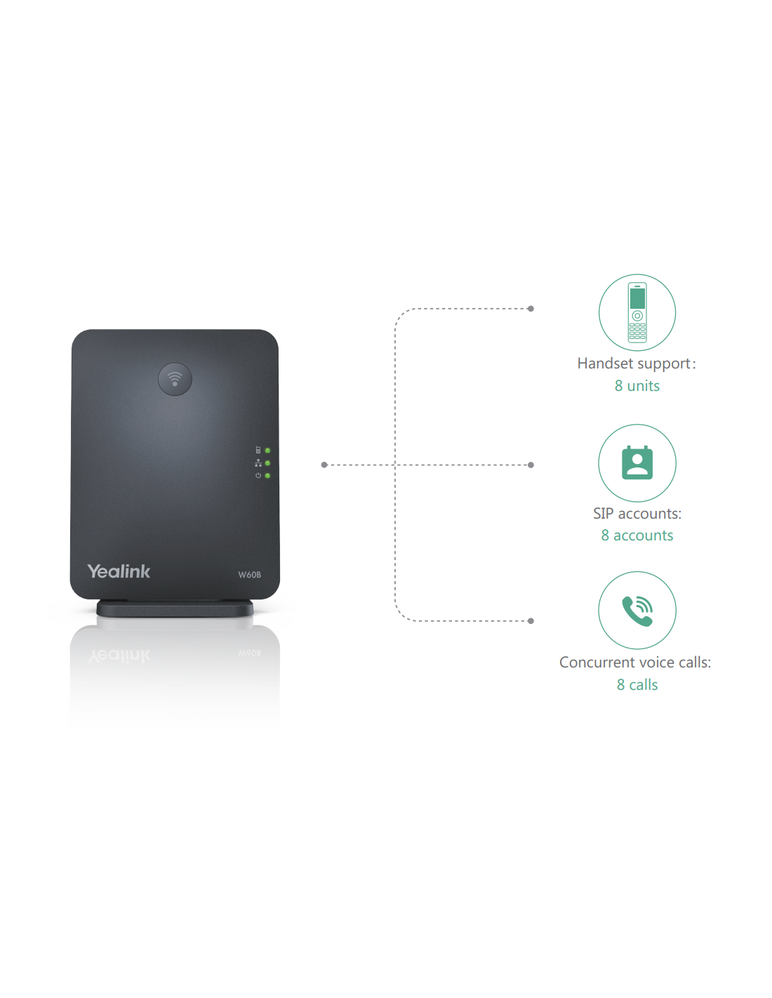 De Yealink W60P DECT Basis + Handset (SIP) is een high performance DECT-systeem bestaande uit een Yealink W60B DECT-basisstation en Yealink W56H DECT-handset. Op het basisstation zijn tot 8 toestellen aanmeldbaar en u kunt per toestel maximaal 2 gelijktijdige gesprekken voeren tot een maximum van 8 per basisstation.