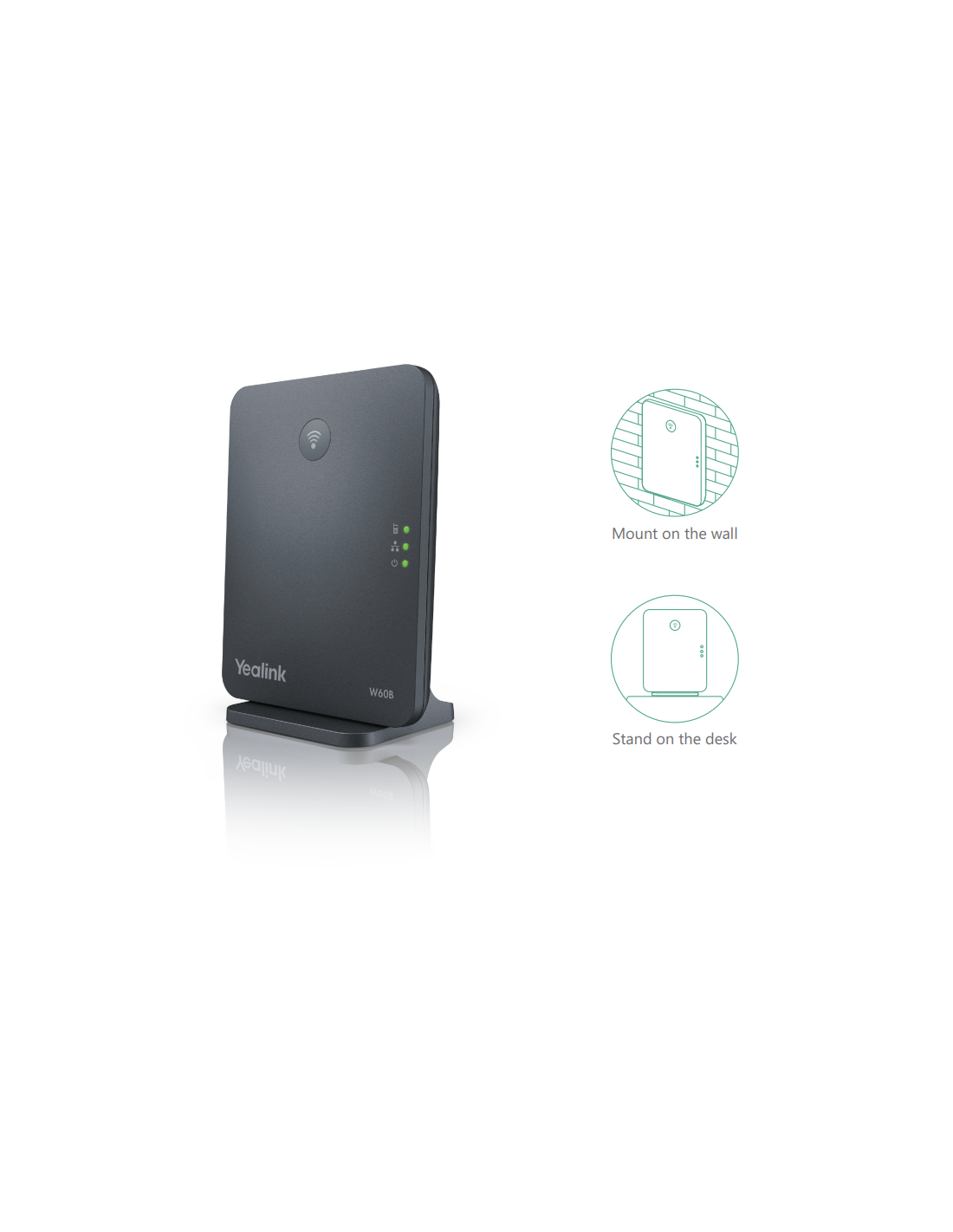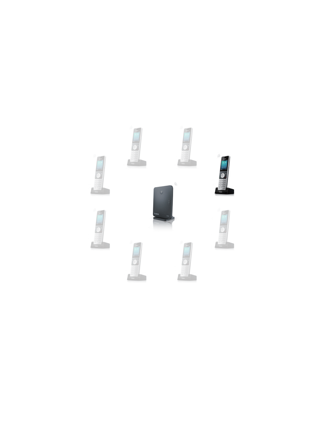 De Yealink W60P DECT Basis + Handset (SIP) bestaat uit een W60B DECT-basisstation en een W56H DECT-handset. Naast de meegeleverde handset kunt u andere DECT toestellen op het DECT basisstation aanmelden, zoals de Yealink CP930W (vergadertelefoon), Yealink T41S/T42S met DD10K DECT USB-adapter (bureautoestel), of extra handsets.