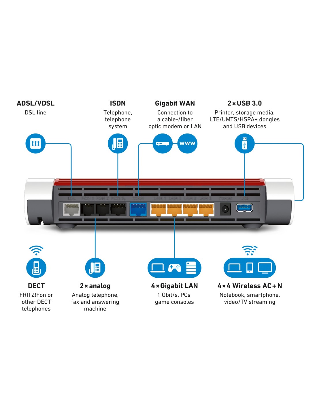 Videos, muziek en foto's kunnen razendsnel zonder laadbalken worden gedeeld in het thuisnetwerk met uw smartphone, tablet of computer. De 7590 maakt gebruik van de 802.11ac en 802.11n WiFi standaard en Multi-User MIMO om snelheden tot 1733 Mbit/s te bereiken op de 5 GHz frequentieband en 800 Mbit/s op de 2,4 GHz frequentieband.