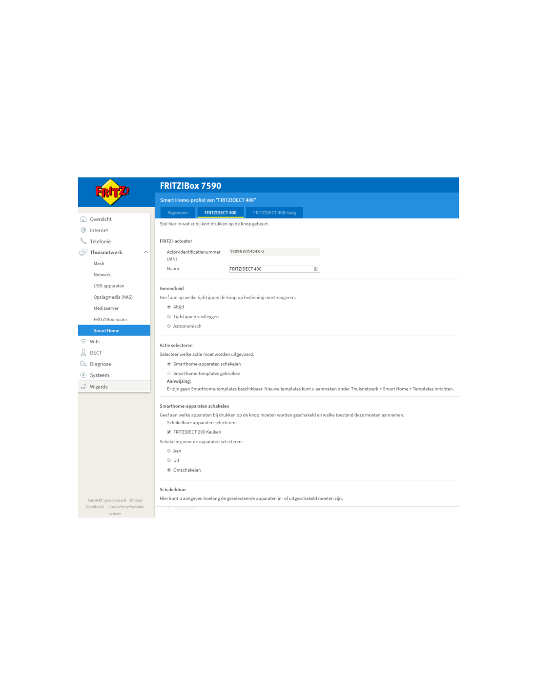 NB: De FRITZ!DECT 400 werkt alleen op FRITZ!Boxen met een ingebouwd DECT-basisstation, voorzien van FRITZ!OS 7.01 of hoger en schakelt alleen apparatuur aangesloten op de FRITZ!DECT 200/210.
