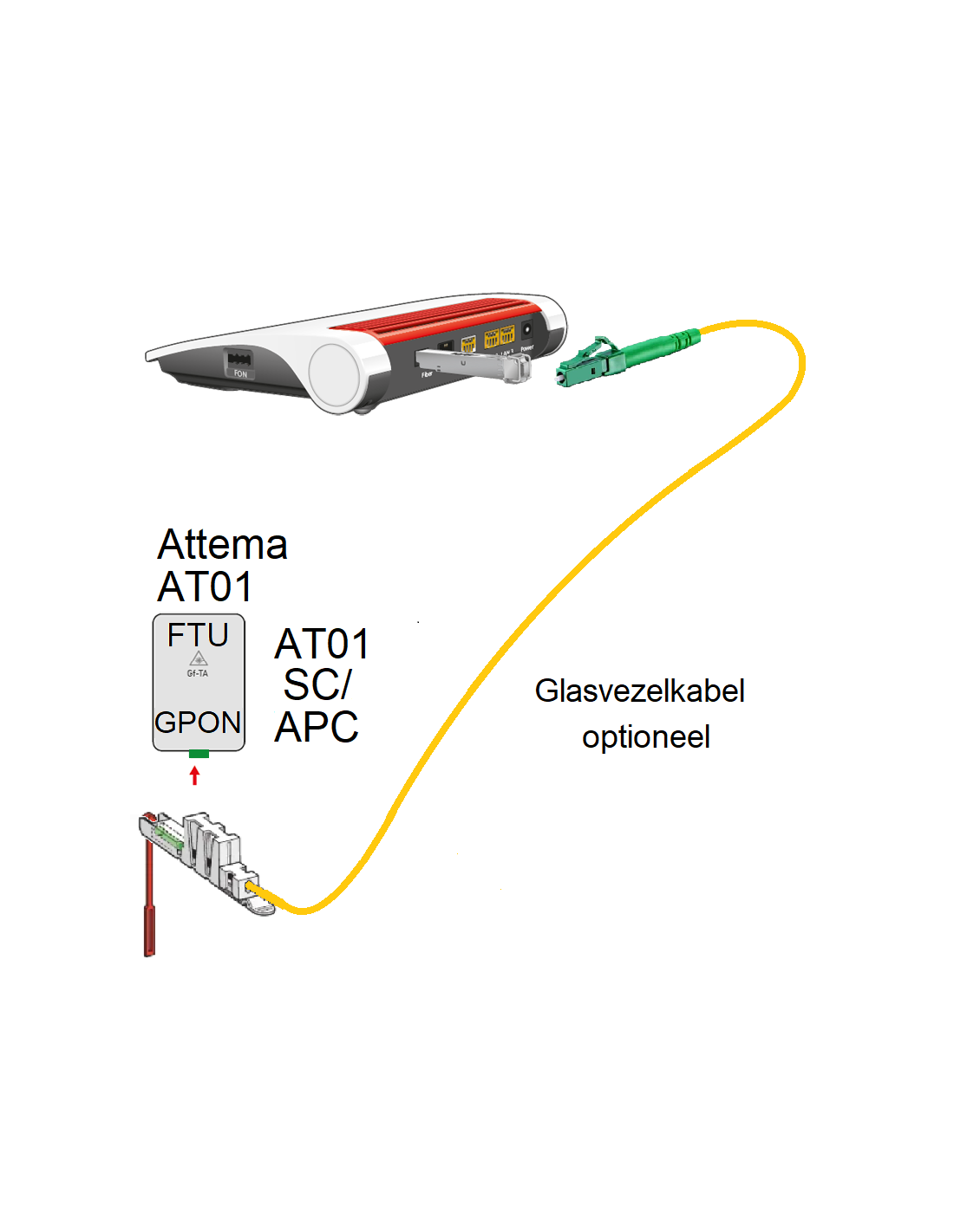 - met een Attema aansluiting: Glasvezel Attema AT01 (FTU-zijde SC-GROEN - LC-GROEN)