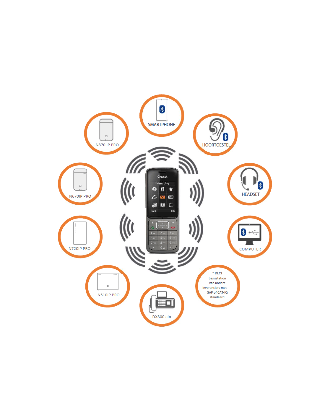 - Volledige compatibiliteit met het N510IP-basisstation en het N670/N720IP/N870-multicelsysteem van Gigaset Pro