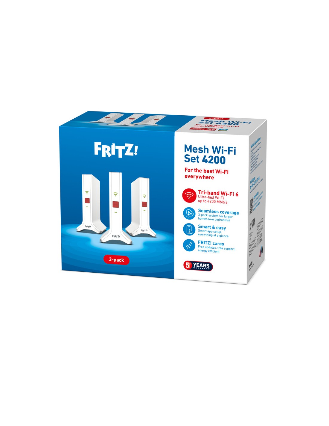 De nieuwe FRITZ!Mesh Wi-Fi Set 4200 biedt met triband-Wi-Fi 6 krachtige en snelle Wi-Fi. De FRITZ!Mesh Wi-Fi Set 4200 wordt geleverd met twee (‘duopack’) of drie (‘triopack’) FRITZ!Repeaters 3000 AX. Na de plug and play-installatie heeft de gebruiker in slechts enkele minuten overal krachtige Mesh Wi-Fi. Naadloze dekking: met de optimale Wi-Fi-dekking is supersnel internetten, streamen en gamen in het hele thuisnetwerk mogelijk. De nieuwe FRITZ!Mesh Wi-Fi Set is in Europa geproduceerd en voldoet aan de hoogste kwaliteitsnormen, waardoor maximale veiligheid wordt gegarandeerd. Uitgerust met het besturingssysteem FRITZ!OS wordt zo een volwaardig Mesh-thuisnetwerk opgezet dat alle voordelen van FRITZ! biedt. Gratis Updates, gratis support, energie-efficiëntie en 5 jaar garantie maken het plaatje compleet.