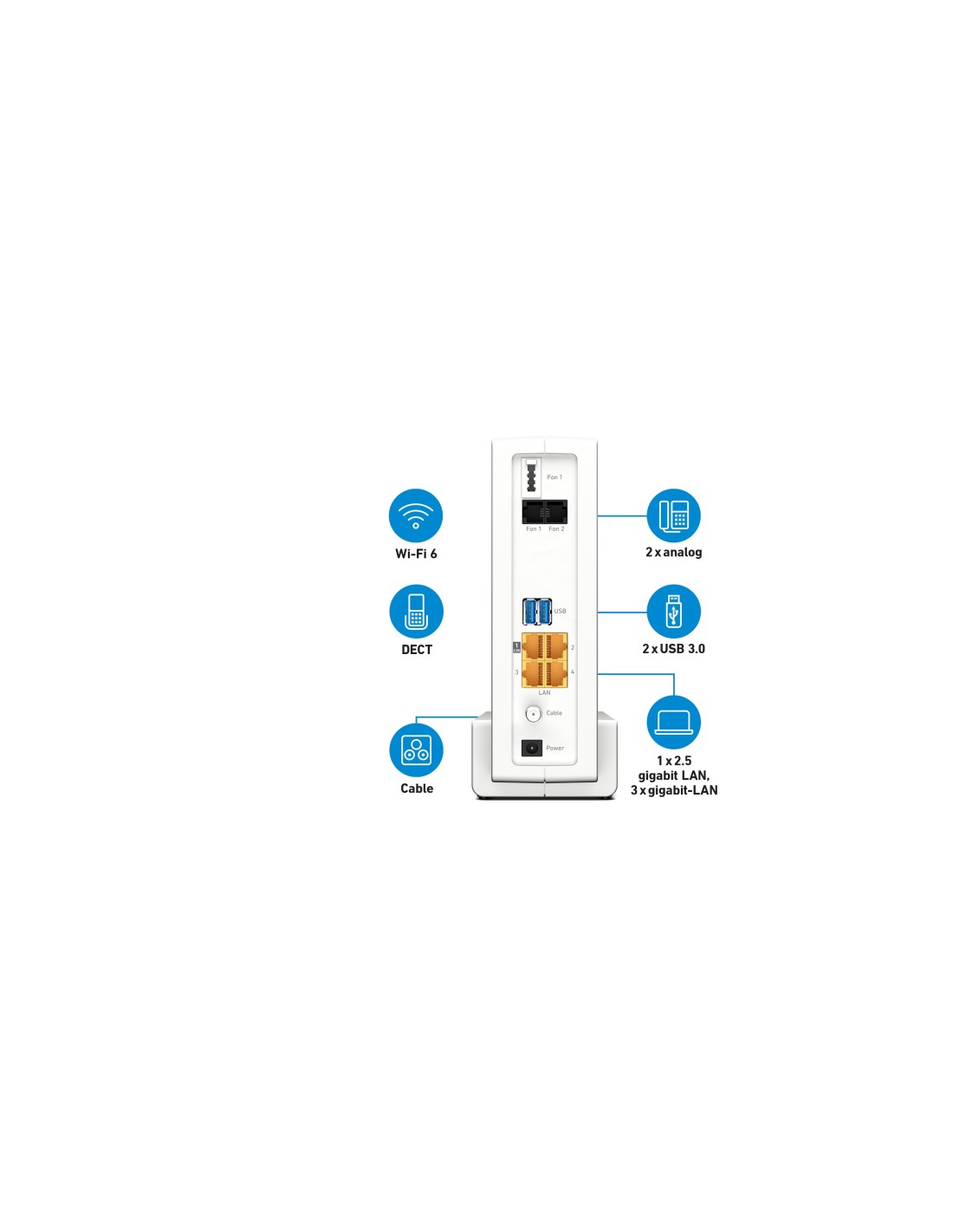 De krachtige DOCSIS 3.1 kabelmodem biedt tot 6 Gbit/s downstream-snelheid en is neerwaarts compatibel met EuroDOCSIS 3.0. Snelle WiFi 6 maakt voor al je multimedia-apparaten draadloze internettoegang mogelijk, Multi User-MIMO zorgt ook bij parallel gebruik van verschillende apparaten voor topwaarden bij de transmissiesnelheid. Een 2,5 Gigabit LAN-aansluiting, drie 1 Gigabit LAN-aansluitingen en een krachtige telefooncentrale met veel functies maken de uitrusting compleet.