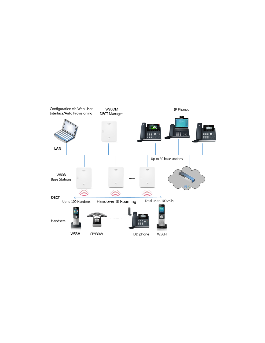 De Yealink W80DM DECT Manager is de beheerder van uw DECT netwerk. De DECT Manager is verbonden met de Yealink W80B basisstations. Op één W80DM DECT Manager kunt u maximaal 30 stuks W80B basisstations en in totaal max. 100 Yealink DECT-toestellen aanmelden. Het aantal benodigde basisstations is o.a. afhankelijk van de locatie en de gewenste gesprekscapaciteit. De Yealink W80 DECT apparatuur wordt via een netwerkkabel op uw netwerk aangesloten. Via dezelfde netwerkkabel is het mogelijk om de Yealink W80 DECT apparatuur van voeding te voorzien door de Power-over-Ethernet technologie. Het Yealink W80B DECT Basisstation meldt u aan op de Yealink W80DM DECT Manager. Op het Yealink W80B DECT Basisstation kunt u vervolgens uw handsets aanmelden. Aldus kunt u uw Yealink W80 DECT-systeem schalen tot max. 30 Yealink W80B basisstations en max. 100 Yealink DECT-toestellen per Manager (verdeeld over de basisstations).